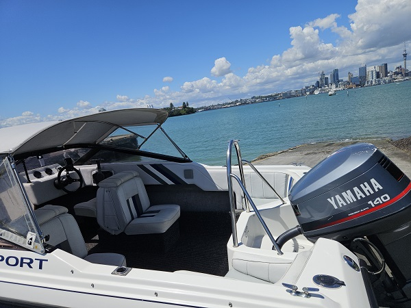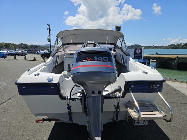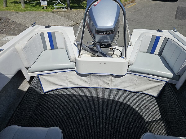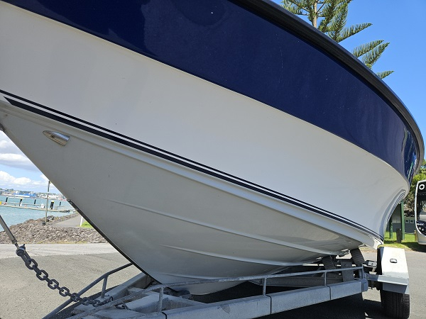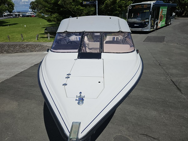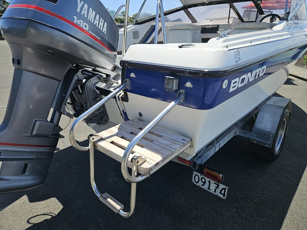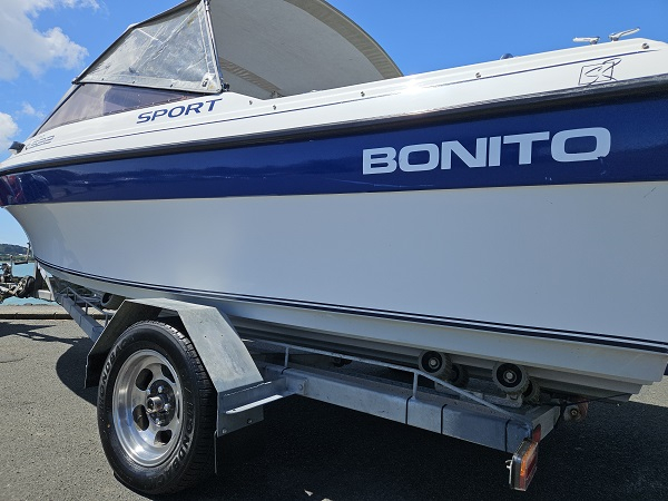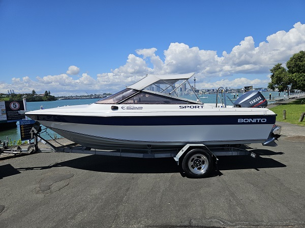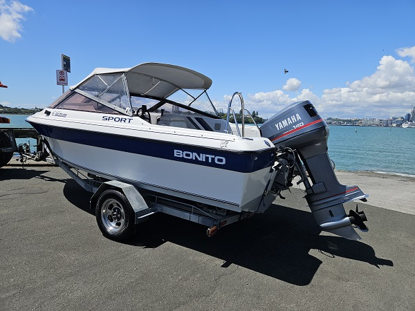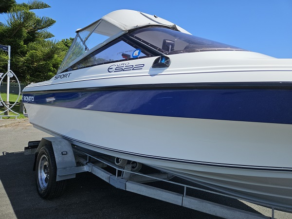 Beautiful 1992 Bonito Euro 522 Sport, history of fresh water use, Yamaha 140 hp 2-stroke, very tidy condition, fully serviced, great on gas, plenty of power, hydraulic steering, underfloor fuel tank, 6 seater, upholstery in great condition, Lowrance Elite-4x fish finder, center opening windscreen to access anchor locker, cup holders, nice canopy with clear side curtains, stainless ski frame, teak boarding ladder. Comes on nice galvanised disc braked trailer with regn and wof. Very clean example of a popular NZ classic.