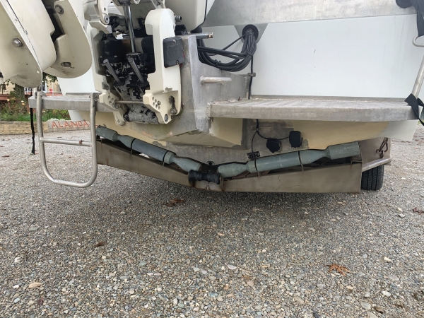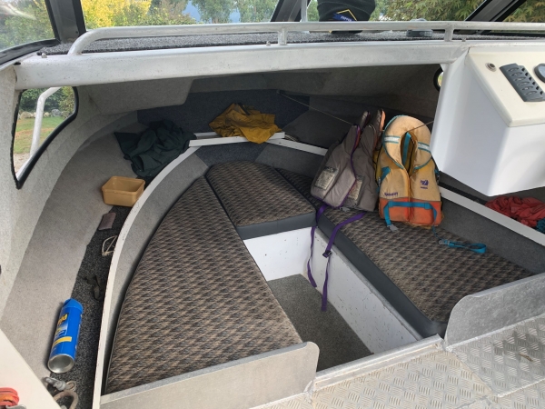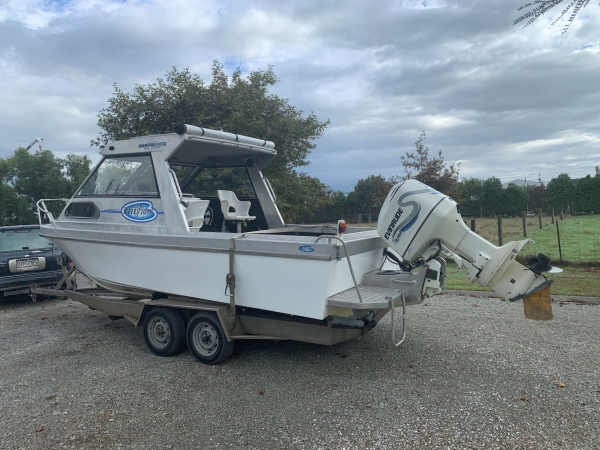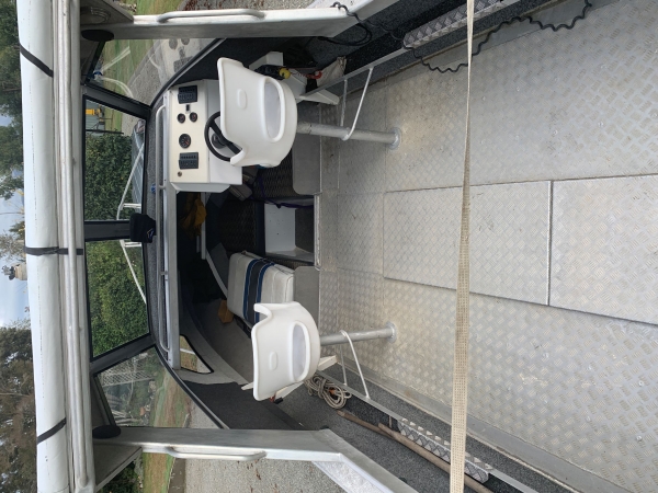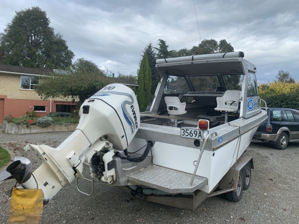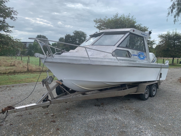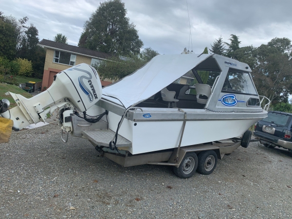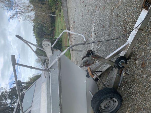 Has a two axle stainless trailer with spare wheels bearing buddies and jockey wheel.