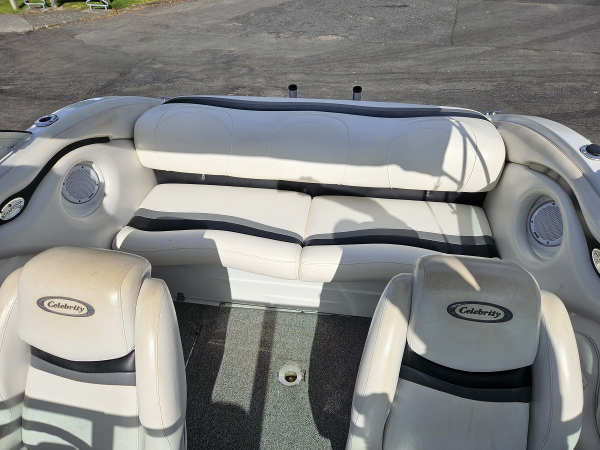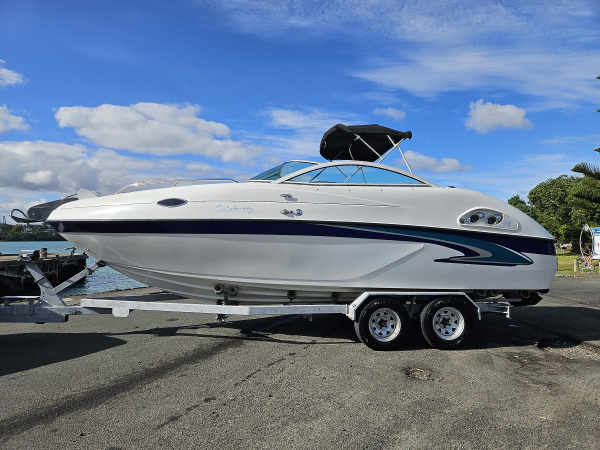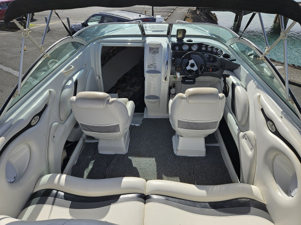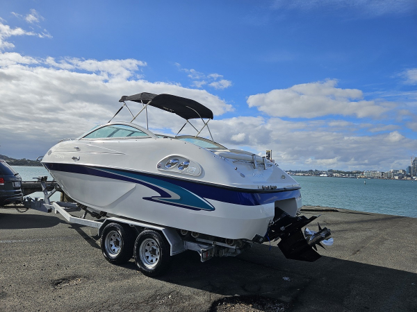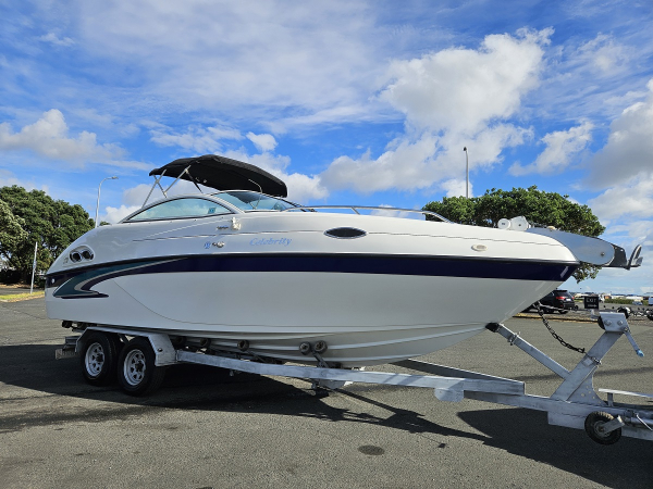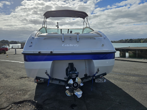 Summer sale, reduced 10k , Very nice 2000 Celebrity 22 ft overnighter, fitted with 2021 350 hp Mercruiser 6.2 ltr MPI 4-stroke V8 with Bravo Three duo prop sternleg, only 44 hrs , just run in, incredible effortless performance, 6 seater, twin captains chairs, full instrumentation, sleeps 2 in cabin, porta toilet, forward hatch, walk through windscreen to bow, stereo, vhf, Maxwell electric capstan, bimini top sun shade, storage cover, rod holders, cup holders, integrated rear swim platform with ski tow ring and stainless boarding ladder, Comes on tandem galvanised disc braked multi roller trailer with regn and wof. Fantastic looking and performing boat.