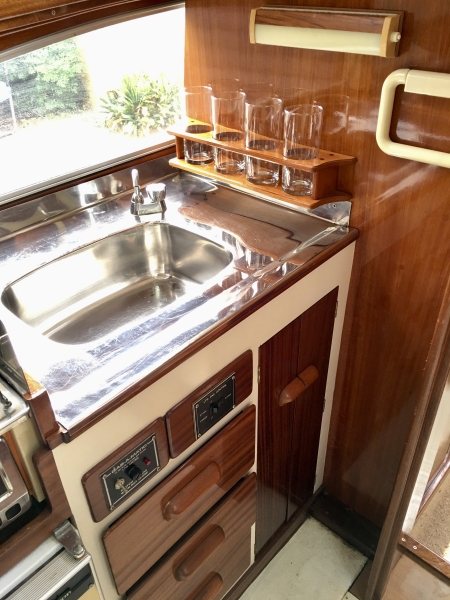 Kitchenette & 2 sinks connecting to a stainless steel fresh water tank and pump
