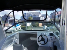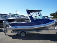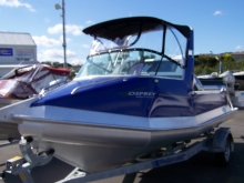 Osprey 500 Classic cuddy cabin finished in blue with high windscreen and radar arch with bimini that fold flat by undoing 2 wing nuts. Good looks, stability at rest, soft ride, roomy cockpit - everything one could ask for in a 5m package.