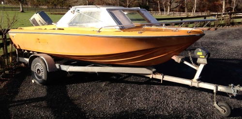 Fibreglass Boat on tipper trailer. Suzuki 85 Horse Motor.