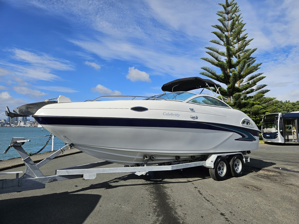 Summer sale, reduced 10k , Very nice 2000 Celebrity 22 ft overnighter, fitted with 2021 350 hp Mercruiser 6.2 ltr MPI 4-stroke V8 with Bravo Three duo prop sternleg, only 44 hrs , just run in, incredible effortless performance, 6 seater, twin captains chairs, full instrumentation, sleeps 2 in cabin, porta toilet, forward hatch, walk through windscreen to bow, stereo, vhf, Maxwell electric capstan, bimini top sun shade, storage cover, rod holders, cup holders, integrated rear swim platform with ski tow ring and stainless boarding ladder, Comes on tandem galvanised disc braked multi roller trailer with regn and wof. Fantastic looking and performing boat.